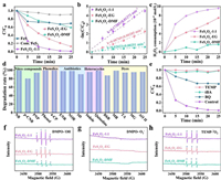 From Raman spectra in Fig. 1d, we also found the existence of defects. Compared to that of standard sample of commercial Fe2O3, the Fe−O bond peak position shifted to lower wavenumbers with larger half peak width, donating the existence of more defects in the corresponding catalyst [19]. Given the existence of defects on the surface of FeSxOy-1:1, solid electron paramagnetic resonance (EPR) was conducted for further identification of the defects (Fig. 1h). Surprisingly, FeSxOy-1:1 showed relatively stronger peak intensity compared to FeSxOy-EG and FeSxOy-DMF. The g factor was 2.0278, indicating the existence of S vacancy. Moreover, FeSxOy-1:1 had the highest Fe proportion (37.81%) and the lowest sulfur ratio (32.45%), indicating that its S vacancy might be the most. Therefore, along with these vacancies, there may be abundant defect electrons on the surface of FeSxOy-1:1, which can accelerate electron transfer as a local electron rich center. FeSxOy-1:1 may have the highest Fenton activity.