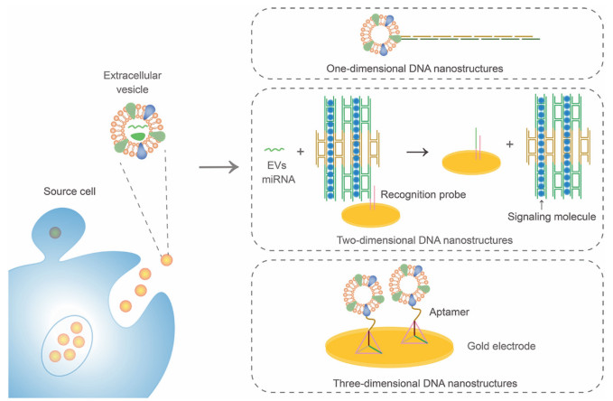 | Fig. 2. The participation of DNA nanotechnology in the detection of EVs. DNA nanostructures are categorized into three types: one-dimensional DNA nanostructures, two-dimensional DNA nanostructures and three-dimensional DNA nanostructures. | |