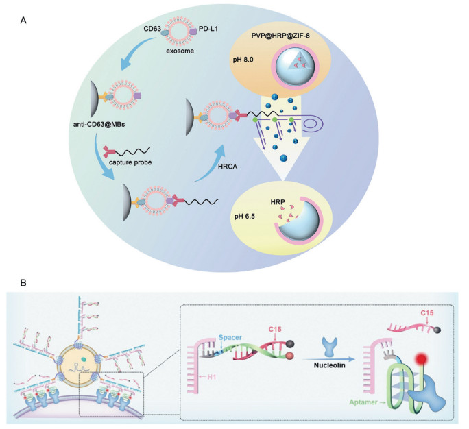 | Fig. 4. Two-dimensional DNA nanostructures assisted EVs biosensors. (A) HRCA and MOFs assisted electrochemical biosensor. Copied with permission [102]. Copyright 2020, Elsevier. (B) Polymeric DNA structures produced via HCR were engineered onto exosome membranes to serve as sensing probe. Fluorescence recovery occurred upon encountering targeted cells. Copied with permission [104]. Copyright 2022, American Chemical Society. | |