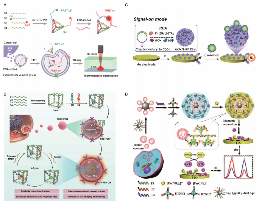 DNA lattices assembled from DNA tiles have highly mechanical rigid architecture. Wherein, DNA tetrahedra seems to be the mostly used 3D nanostructures in the field [109,110]. Han and co-workers reported the detection of mRNA in EVs using DNA tetrahedron (Fig. 5A) [110]. Target mRNA enhanced fluorescence resonance energy transfer signal was further amplified by thermophoretic effect to accomplish ultrasensitive detection. Xu and co-workers used a switchable DNA tetrahedra scaffold for the detection of breast cancer-derived EVs [111]. The tetrahedra contained G-quadruplex mimicking DNAzyme sequence and biomarker specific aptamer sequence. With the presence of target EVs, G-quadruplex was released from the tetrahedra scaffold and catalyzed the colorless substrate into a colored product. DNA tetrahedra can also be used to capture EVs instead of unmodified aptamers to avoid entanglement, aggregation and spatial hindrance effect that influence the recognition efficiency of capture probe. Liao and co-workers used DNA tetrahedra to capture EVs onto the Au film. Then polydopamine-functionalized AuNPs were bound with the captured EVs to assist surface plasmon resonance [SPR] signal amplification [112]. Similarly, Jiang and co-workers anchored DNA tetrahedra on the gold electrode surface to capture EVs [113]. Other DNA lattices have also been built to assist the molecular analysis of EVs [114]. Chen and co-workers synthesized a DNA nanoframe for in situ monitoring of exosomal miRNA and exosome tracing (Fig. 5B) [115]. The proposed nanoframe contained a nanocube and two fluorescence labeled hairpins. Target miRNA hybridized with the hairpins to form a duplex structure, leading to fluorescence resonance energy transfer (FRET); and the released miRNA could participate in the new catalytic cycle.