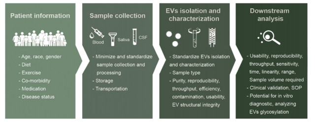 Numerous shreds of evidence have pointed out the potential of EVs in improving the diagnosis and prognosis of various diseases, here we only list a few of them. The majority of studies on EVs as diagnostic and prognostic biomarkers are focused on cancers. By promoting cancer cells growth, invasion and metastasis, enhancing angiogenesis, EVs play a significant important role in tumorigenesis [19,20]. Differential expression of EVs proteins and their cargo are noted in various types of cancer [21] including gastric cancer [22], bladder cancer [23], breast cancer [24,25] and ovarian cancer [26]. In cardiovascular disease [27], since cellular activation and apoptosis can trigger the release of EVs, patients with systemic endothelial damage show significantly increased levels of circulating endothelial cell derived EVs [28]. More recently, the role of EVs in the initiation and progression of neurodegenerative diseases has been validated. As EVs can cross the blood-brain barrier, they can give a fine imprint of central nervous system associated disease pathologies including Alzheimer's disease [29], Parkinson's disease [30], Huntington's disease and amyotrophic lateral sclerosis [17]. Moreover, EVs can also serve as biomarkers in type 2 diabetes [31,32], autoimmunity disease [33], sepsis and acute respiratory distress syndrome (ARDS) [34].
