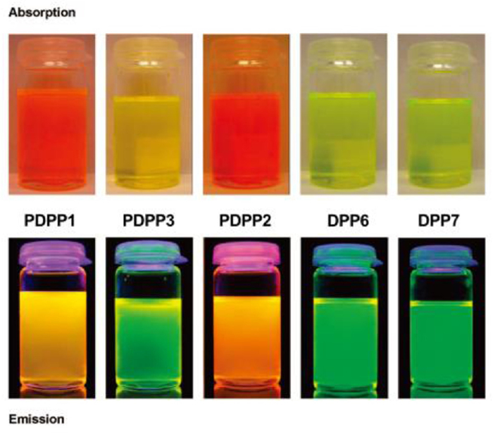 | Fig. 1. Photo images of polymers PDPP1, PDPP2 and PDPP3 and monomers DPP6 and DPP7 in solutions under visible light (up) and UV light (down). Reproduced with permission [38]. Copyright 2008, Wiley-VCH. | |