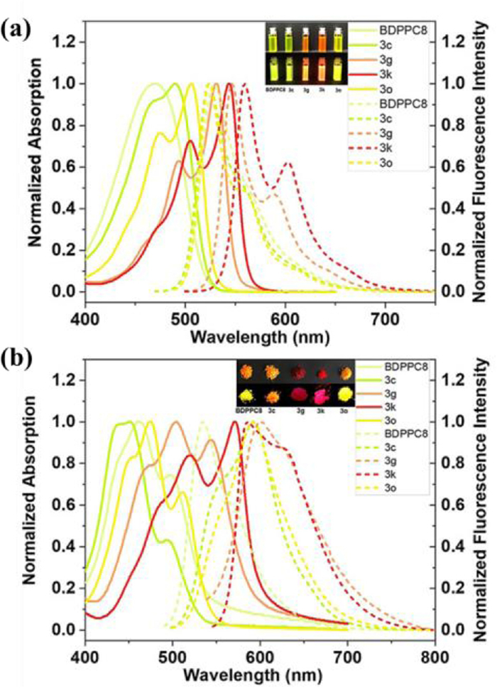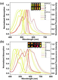 | Fig. 2. UV–vis absorption and fluorescence spectra of DPP52, DPP56, DPP60 and DPP64, corresponding to 3c, 3g, 3k and 3o in solutions (a) and in solid states (b). Reproduced with permission [50]. Copyright 2021, Wiley-VCH. | |