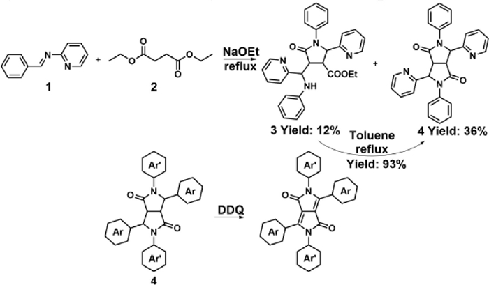 2. Synthesis of N-aryl DPPs 2.1. Bis-N-aryl DPPsThe synthesis of N-aryl DPPs was started in the 1980s. In 1976, Sprake and coworkers reported N-aryl DPP precursor 4 (2,5-diphenyl-3,6-di(pyridin-2-yl)hexahydropyrrolo[3,4-c]pyrrole-1,4‑dione) by reacting 2-(N-phenylformimidoyl)pyridine (1) with diethyl succinate (2) under base in 36% yield (Scheme 2) [31]. Half-fused pyrrolidone 3 was also obtained, which was transformed to compound 4 when refluxed in toluene in 93% yield. In 1984, Iqbal and coworkers from Ciba-Geigy found that compound 4 and other similar structures with four aromatic groups can be transformed to N-aryl DPPs in the presence of oxidant 1,2-dichloro-4,5-dicyanobenzoquinone (DDQ) (Scheme 2) [32,33]. This method was convenient for those tetraaryl DPPs that were difficult to synthesize. Unfortunately, no further development was observed in this method since the yield at the early stage was not satisfactory.