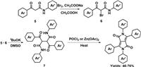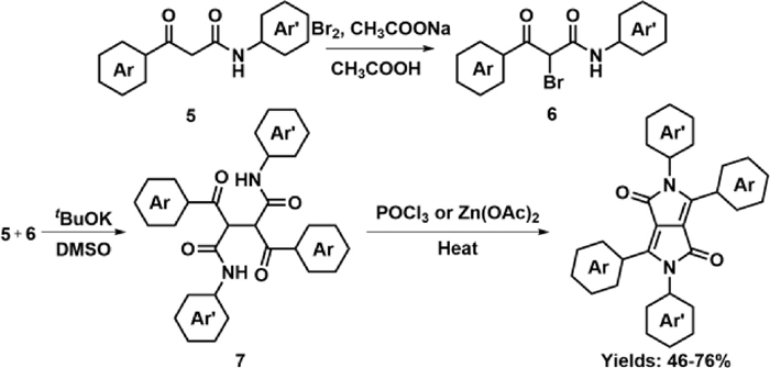 In 2002, Chamberlain and Thornley from Sun Chemical Corporation developed a synthetic method for the N-arylation of DPPs [34]. As shown in Scheme 3, β-ketoamide 5 was transformed to brominated derivative 6 in the presence of bromine and sodium acetate. Diaryl succinamide 7 was obtained by the alkylation of 5 with 6 under the base. Finally, N-aryl DPPs were obtained by the condensation of 7 with phosphorus oxychloride or zinc acetate in 46%−76% yields.