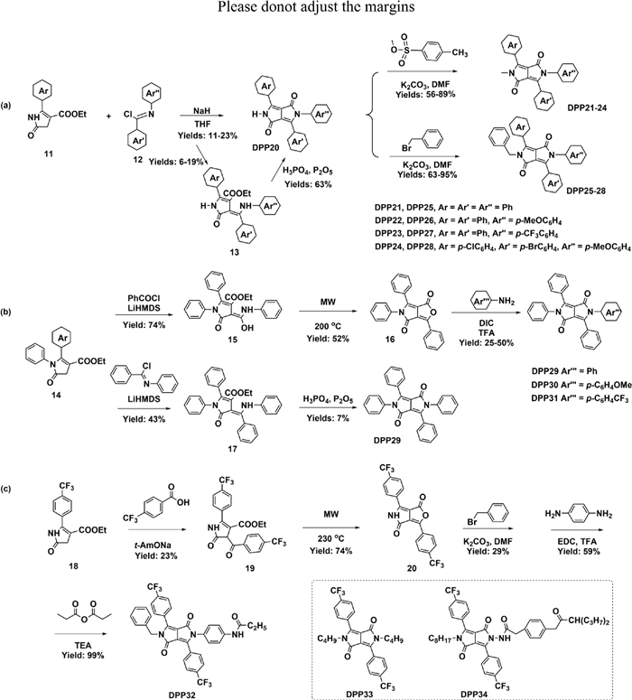 | Scheme 6. Synthetic routes for mono-N-aryl DPPs and non-symmetric N-aryl DPPs. (a, b) Synthetic routes for mono-N-aryl DPPs (DPP21–28) and non-symmetric N-aryl DPPs (DPP30 and DPP31), developed by Smith et al. [45]. (c) Synthetic routes for mono-N-aryl DPP (DPP32) and chemical structures of two N-alkyl DPPs (DPP33 and DPP34), developed by Vullev et al. [46]. | |