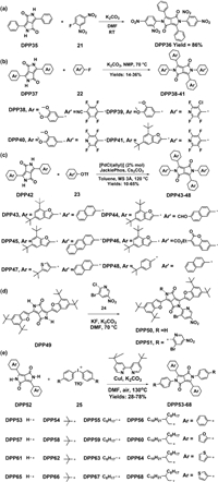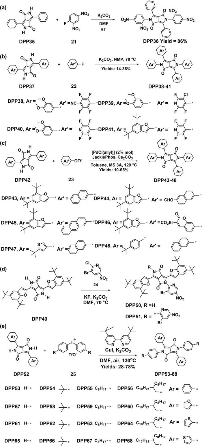 | Scheme 7. Synthetic routes for N-aryl DPPs developed by Smith et al. (a) [45], Gryko et al. (b-d) [47-49] and Zhang et al. (e) [50]. | |