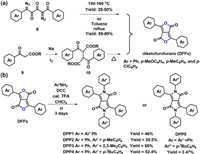 | Scheme 4. A common synthetic route for N-arylated DPPs (DPP1–5), developed by Rubin et al. [35] and Langhals et al. [36]. (a) The synthetic route for the key precursor DFF. (b) The synthetic method of N-arylated DPPs by the condensation of DFFs and anilines. | |
