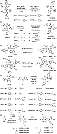 | Scheme 8. Synthetic routes for π-expanded DPPs based on N-aryl DPPs developed byWürthner et al. (a) [51], Yue et al. (b) [52], Gryko et al. (c) [49] and Zhang et al. (d) [50]. (e) Synthetic routes for the symmetric pyridine-flanked DPP complexes developed by Yamagata et al. [53]. | |