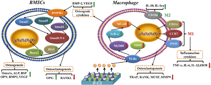 Chen et al. found that, as a commonly used coating material, β-tricalcium phosphate (β-TCP) extract could induce macrophages to polarize toward the M2 type, the mechanism of which was related to the activation of the CaSR pathway. The expression of BMP-2 was also significantly increased, suggesting that macrophages may be involved in the β-TCP-induced bone regeneration response; when the macrophage-conditioned β-TCP extract was applied to BMSCs, the osteogenic differentiation of BMSCs was significantly enhanced, indicating that macrophages play an important role in the osteogenic response induced by biomaterials [2]. Magnesium (Mg) is widely used in orthopedics due to its unique biodegradability, biocompatibility, good mechanical properties, and osteogenic action, but the rapid degradation of Mg in the body can trigger an acute inflammatory response [3]. Therefore, its further application in bone tissue engineering is limited. In a later study, Chen et al. coated a Mg scaffold with β-TCP to construct a Mg-β-TCP scaffold with excellent bone immunomodulatory properties. The β-TCP coating reduced the degradation rate of the Mg scaffold and induced the polarization of macrophages to the M2 type, which may have inhibited the TLR pathway. VEGF and BMP-2 were significantly upregulated in macrophages exposed to the Mg-β-TCP scaffold, indicating that the macrophages in the β-TCP-modified Mg scaffold had osteogenic properties; when BMSCs were stimulated by the conditioned medium of the macrophages cultured on the Mg-β-TCP scaffold, the osteogenic differentiation of BMSCs was significantly upregulated. Thus, the macrophages in the Mg-β-TCP scaffold had osteogenic properties [4]. Li et al. used plasma spraying technology to combine cerium dioxide having antioxidative activity with hydroxyapatite coating and found that after coculture with macrophages, the expression of the M2 macrophage markers CD163 and CD206 was significantly upregulated and anti-inflammatory cytokines (IL-10 and IL-1) were elevated, suggesting that mixed coatings could induce macrophage polarization [5]. The hypoxic microenvironment can regulate local immune responses, thereby promoting tissue repair. Zhou et al. added copper ion (Cu2+) to mesoporous bioactive glass to generate a hypoxia-like microenvironment, activate the HIF-1α pathway, and enhance host angiogenesis. They also found that local M2 macrophage infiltration increased, indicating regulation of macrophages by Cu2+. Others studies showed that the surface of Cu2+-containing nanobioceramics (Cu-Hier-Ti) enhanced osteogenesis and bactericidal activity [6,7]. Titanium and titanium alloys have been widely used as implant materials in the body due to their unique physical and chemical properties, but these take a long time to achieve sufficient bone ingrowth and bone remodeling [8]. Excessive differentiation of M1 macrophages around pure titanium artificial joints can lead to bone resorption and implant loosening around the prosthesis [9]. Lu et al. sprayed a calcium borosilicate (Ca11Si4B2O22) coating on pure titanium material, finding that its degradation products promoted the transition of macrophages from M1 to M2 by inhibiting the TLR signaling pathway, increased anti-inflammatory factor (IL-10 and IL-1) levels, reduced the expression of proinflammatory cytokines (iNOS, IL-6, and TNF-α), stimulated the osteogenic differentiation of BMSCs, and inhibited the differentiation of macrophages into osteoclasts (Fig. 1) [10]. Zhang et al. also found that aminated salinized titanium could reduce the inflammatory response and promote the chemical immunomodulatory effect of M2 polarization in macrophages [11]. Lu et al. found that a phase-transited lysozyme (PTL) coating on the surface of titanium materials improved the migration and adhesion of cells, and the PTL with Sr coating stably released strontium ions to promote cell migration and bone formation. In addition, PTL with Sr regulated the immune response of macrophages, thereby enhancing the recruitment of BMSCs and their osteogenic differentiation [12].