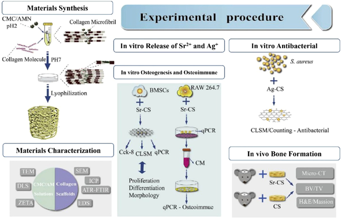 | Fig. 2. Sr doped collagen scaffolds (Sr-CS) promoted in vitro cell proliferation and osteogenic differentiation of bone marrow mesenchymal stromal cells (BMSCs) and synergistically improved osteogenesis of BMSCs by altering the macrophage response. Copied with permission [21]. Copyright 2020, KeAi Communications Co., Ltd. | |