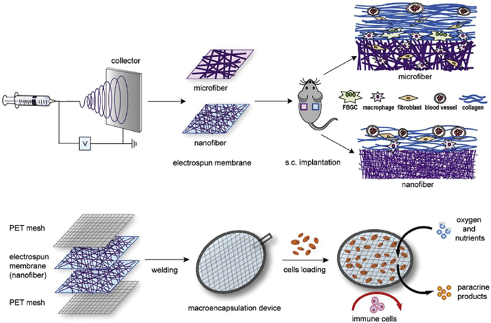 | Fig. 3. Electrospun membranes based on thermoplastic polyurethane (TPU) were fabricated to contain microfibers (PU-micro) or nanofibers (PU-nano): PU-nano caused minimal macrophage responses in vitro and in vivo and induced only mild foreign body reactions compared to PU-micro membranes. Copied with permission [47]. Copyright 2016, Elsevier Ltd. | |