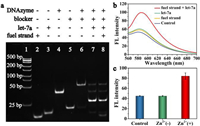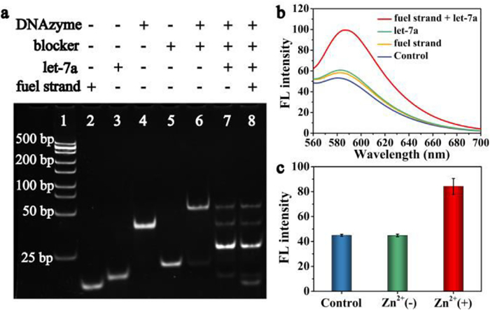 Firstly, the TSDR was verified by the native polyacrylamide gel electrophoresis (PAGE) (Fig. 1a). Lane 1 was the DNA marker and Lanes 2-5 were fuel strand, DNA let-7a, DNAzyme and blocker, respectively. Compared with Lanes 4 and 5, the migration rate of Lane 6 was slower, indicating the successful hybridization of DNAzyme and blocker. Besides, both Lanes 7 and 8 showed a band corresponding to Lane 4, which was the released DNAzyme. Since blocker-target let-7a and blocker-fuel strand have similar molecular weight, the feasibility of the TSDR was further verified by fluorescence spectra. The distance between TAMRA and BHQ2 modified at both ends of the substrate strand was less than 10 nm, so that the fluorescence of TAMRA in the substrate strand could be effectively quenched by BHQ2 based on FRET. On the other hand, the DNAzyme activity in the dsDNA formed by blocker hybridization with DNAzyme was blocked. At this point, DNAzyme could not recognize and cut the substrate strand, thus TAMRA fluorescence was low (Fig. 1b). Compared with the addition of let-7a alone, the fluorescence recovery of TAMRA was higher after further introduction of fuel strand. This revealed that the introduction of fuel strand could successfully trigger TSDR, so as to cyclically release more DNAzyme for substrate cutting, which proved that the DNA sequence design of TSDR was reasonable. It is worth noting that the fluorescence of TAMRA hardly recovered when only the fuel strand was present, indicating that the fuel strand could not replace the DNAzyme in the dsDNA formed by blocker and DNAzyme to start the DNAzyme cycle, thus confirming the stability of the TSDR. In addition, when only DNAzyme and substrate strand were present, the fluorescence of TAMRA hardly recovered in the absence of Zn2+ compared with that in the presence of Zn2+, demonstrating that DNAzyme cycle could run smoothly with the assistance of Zn2+ (Fig. 1c).