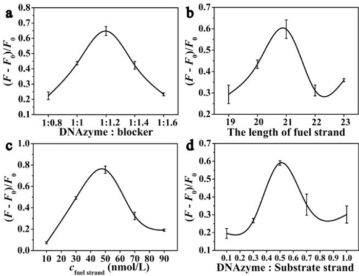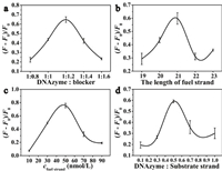 | Fig. 3. Experimental conditions optimization for the detection of let-7a. (a) The ratio of DNAzyme to blocker, (b) the length of fuel strand, (c) fuel strand concentration and (d) the ratio of DNAzyme to substrate strand on the let-7a detection. Concentrations: DNAzyme, 25 nmol/L; blocker, 30 nmol/L; fuel strand, 50 nmol/L; substrate strand, 50 nmol/L; Zn2+, 1.25 mmol/L; let-7a, 10 nmol/L; time: 30 min; temperature: 37 ℃. Each measurement was performed in triplicate (error bars indicate standard deviation). | |