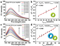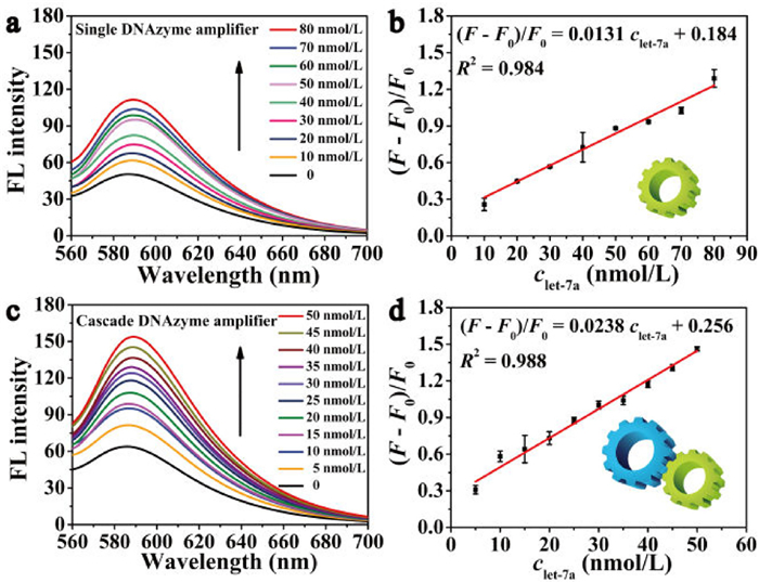 | Fig. 4. Fluorescence spectra of the detection of let-7a by the single DNAzyme amplifier (a, b) and by the cascade DNAzyme amplifier (c, d). Concentrations: DNAzyme, 25 nmol/L; blocker, 30 nmol/L; fuel strand, 50 nmol/L; substrate strand, 50 nmol/L; Zn2+, 1.25 mmol/L. Time: 30 min. Temperature: 37 ℃. Each measurement was performed in triplicate (error bars indicate standard deviation). | |