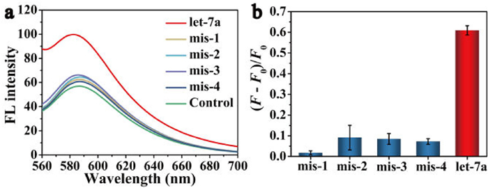 | Fig. 5. Specificity of let-7a detection. (a) Fluorescence spectra of specificity detection of let-7a. (b) (F − F0)/F0 histogram of specificity detection of let-7a. Concentrations: DNAzyme, 25 nmol/L; blocker, 30 nmol/L; fuel strand, 50 nmol/L; substrate strand, 50 nmol/L; Zn2+, 1.25 mmol/L; let-7a and other four mismatched miRNA, 10 nmol/L. Time: 30 min. Temperature: 37 ℃. Each measurement was performed in triplicate (error bars indicate standard deviation). | |