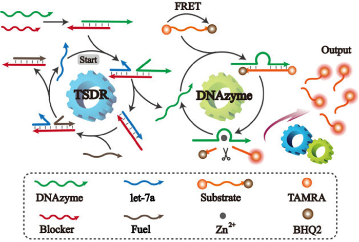 Herein, a TSDR-propelled cascade DNAzyme amplifier was assembled by exploiting concurrent amplification cycle principles of TSDR and DNAzyme (Scheme 1). At the beginning, the fluorescence of tetramethyl rhodamine (TAMRA) in the substrate strand could be effectively quenched by black hole quencher 2 (BHQ2) based on FRET. Besides, DNAzyme activity is first inhibited after the hybridization with blocker DNA, which can be competed in the presence of target let-7a, resulting in the release of DNAzyme for recognizing the active site of the substrate strand and cutting it. Subsequently, the fuel strand can bind to the blocker in the double stranded DNA (dsDNA) to cyclically release the target let-7a by utilizing TSDR, resulting in more DNAzymes to be released to realize the first amplification. Furthermore, on the basis of second signal amplification driven by Zn2+-assisted DNAzyme amplifiers, these released DNAzymes by TSDR can cyclically cleave the substrate strand, leading to higher fluorescence recovery of TAMRA, thus achieving dual signal amplification with lower cost and simpler procedures. Based on this, the sensitivity of let-7a detection was effectively improved by the TSDR-propelled cascade DNAzyme amplifier compared to single DNAzyme amplifier.