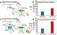 | Fig. 2. Comparison of the single DNAzyme amplifier and cascade DNAzyme amplifier in let-7a detection. (a, b) Schematic diagram and fluorescence response for the detection of let-7a by the single DNAzyme amplifier. (c, d) Schematic diagram and fluorescence response for the detection of let-7a by the cascade DNAzyme amplifier. let 7a (+) and let 7a (−) represented the presence and absence of let-7a in the system, respectively. Concentrations: DNAzyme, 25 nmol/L; blocker, 30 nmol/L; fuel strand, 50 nmol/L; substrate strand, 50 nmol/L; Zn2+, 1.25 mmol/L; let-7a, 40 nmol/L; time: 30 min; temperature: 37 ℃. Each measurement was performed in triplicate (error bars indicate standard deviation). | |