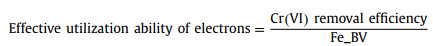 In mFe/Cu bimetallic system, there are three direct ways of utilizing electrons released by Fe0 in the Cr(Ⅵ) removal process [24]: (ⅰ) oxygen gains electrons to produce reactive oxygen species or iron oxides; (ⅱ) protons captures electrons to generate hydrogen; (ⅲ) Cr(Ⅵ) captures electrons and is reduced, which can be called the electron effective utilization path. We take the ratio of Cr(Ⅵ) removal efficiency to Fe_BV, a parameter representing Fe electron release, as the effective utilization ability of electrons, and the calculation formula is as follows (Eq. 2):