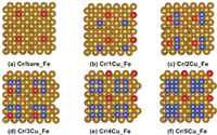 | Fig. 3. Optimized structures with Cr binding on the mFe/Cu surfaces. Red, blue, and brown spheres represent Cr, Cu, and Fe atoms, respectively. | |