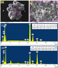 | Fig. 5. SEM images of mFe/Cu bimetal (a) and floccule (b) after the reaction; EDS spectrum of the area in the purple frame of the SEM in part a (c), and EDS spectrum of the area in the purple frame of the SEM in part b (d). | |