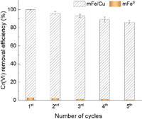 In view of the excellent effect of mFe/Cu bimetals on the removal of Cr(Ⅵ), it is necessary to test the recyclability for long-term use. Fig. 6 shows the Cr(Ⅵ) removal efficiencies of recycle for 5 times with mFe/Cu bimetals, and mFe0 as the control material. After five reuse, Cr(Ⅵ) removal efficiencies were 99.8%, 96.2%, 93.0%, 89.4% and 86.1% in mFe/Cu bimetal system, respectively. As shown in Fig. 6, Cr(Ⅵ) removal efficiencies obtained by mFe/Cu bimetals had obvious advantages over mFe0 every time at the initial pH of 5.8 (without adjusting the initial pH of 20 mg/L Cr(Ⅵ)). Fig. 6 reveals that plating copper on the surface of mFe0 can effectively improve the Cr(Ⅵ) removal efficiency from aqueous solution under nearly neutral conditions. Combined with the previous analysis and the removal efficiency of Cr(Ⅵ), the excellent effect may be attributed to the addition of copper, which improves the ability of mFe0 to adsorb Cr(Ⅵ) and release electrons, and reduces the impedance of mFe0.