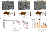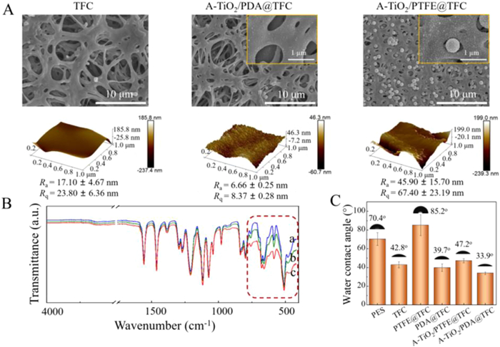 | Fig. 1. SEM, AFM images and FT-IR curves of the SL of (A, B-a) TFC, (A, B-b) A-TiO2/PDA@TFC and (A, B-c) A-TiO2/PTFE@TFC membranes. (C) Water contact angles. The error bar represents the standard deviation of three independent repetitions. | |