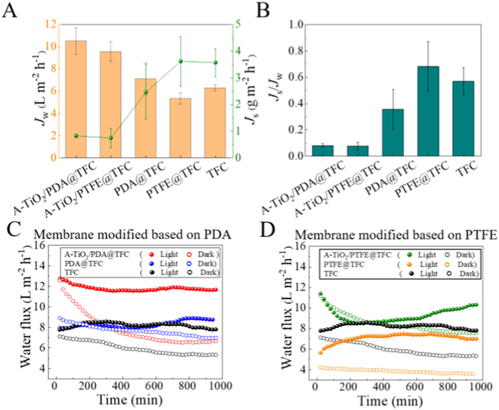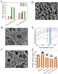 | Fig. 4. (A) TOC removal of A-TiO2/PTFE@TFC and A-TiO2/PDA@TFC membranes under dark or light conditions. SEM micrographs of the supporting layer of (B) TFC, (C) A-TiO2/PDA@TFC and (D) A-TiO2/PTFE@TFC after 16 h illumination, (E) FT-IR curve of A-TiO2/PTFE@TFC, PTFE@TFC, A-TiO2/PDA@TFC and PDA@TFC in dark (a–e) and under illumination (f–j) within a certain wavenumber range, (F) contact angles of A-TiO2/PTFE@TFC and A-TiO2/PDA@TFC membranes. The error bar represents the standard deviation of three independent repetitions. | |