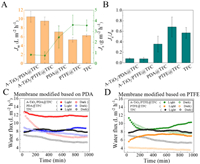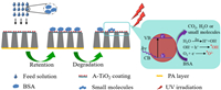 The anti-fouling mechanism of A-TiO2/PDA@TFC and A-TiO2/PTFE@TFC is shown in Fig. 3. In short, during the FO process in the AL-DS mode, BSA gathered and absorbed on the surface of PES substrate due to the membrane absorption and rejection. Then, the UV-responded A-TiO2 generated strong oxidizing species and holes to degrade BSA into small molecule organics, or further degrade part of them into CO2 and H2O, achieving the purpose of mitigating membrane fouling.