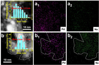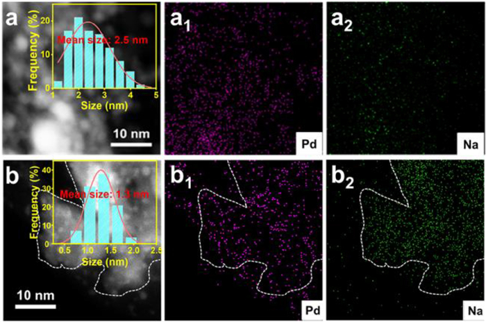 | Fig. 2. HAADF-STEM images of (a) Pd/rGO-ZnCr2O4 and (b) Pd(Na)/rGO-ZnCr2O4 and the corresponding curves of Pd size distribution (inset). (a1, b1 and a2, b2) EDS element maps of Pd and Na for Pd(Na)/rGO-ZnCr2O4 and Pd/rGO-ZnCr2O4, respectively. | |