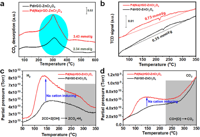 | Fig. 4. (a) CO2 temperature-programmed desorption (CO2-TPD) profiles on Pd(Na)/rGO-ZnCr2O4 and the corresponding Na-free catalyst. (b) CO-TPR profiles of Pd(Na)/rGO-ZnCr2O4 and the corresponding Na-free catalyst, which corresponds to MS signal: (c) H2 and (d) CO2. | |
