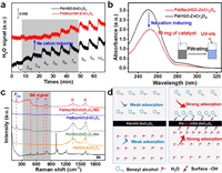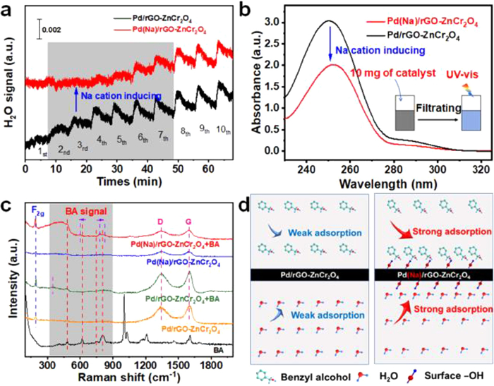 | Fig. 5. (a) H2O pulse curves over the Pd(Na)/rGO-ZnCr2O4 and the corresponding Na-free sample. (b) UV-vis absorption spectra for aqueous solutions after BA is adsorbed over the Pd(Na)/rGO-ZnCr2O4 and the corresponding Na-free sample. (c) Raman spectra of BA, the various catalysts (Pd(Na)/rGO-ZnCr2O4 and Pd/rGO-ZnCr2O4) after adsorbing BA. (d) Adsorption kinetics models of BA and H2O over the Pd(Na)/rGO-ZnCr2O4 and the corresponding Na-free sample. | |