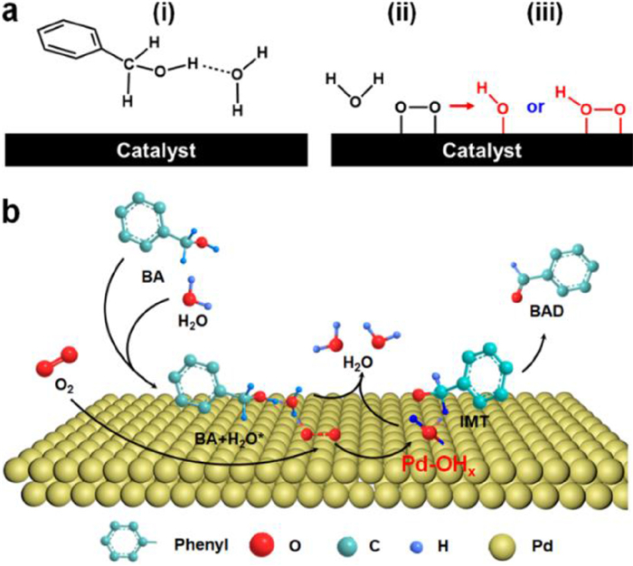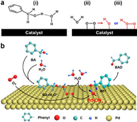 | Fig. 6. (a) Schematic diagram for water-induced oxidation of BA. (b) Scheme of the detailed reaction for BA oxidation on the surface of abundant Pd−OHx. For a better view, only one −OH on the Pd surface is drawn in the schematic. | |