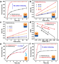 | Fig. 1. (a) Catalytic performance over Pd(Na)/rGO-ZnCr2O4 and Pd/rGO-ZnCr2O4. (b, c) Time-conversion plots at various temperatures for Pd(Na)/rGO-ZnCr2O4 and Pd/rGO-ZnCr2O4 catalyst, respectively. (d) Arrhenius plots for BA oxidation. (e) Response of water injection over the Pd(Na)/rGO-ZnCr2O4 and the corresponding Na-free catalyst for BA oxidation, with toluene as reaction solvent. (f) Catalytic activity test over Pd(K)/rGO-ZnCr2O4 and Pd/rGO-ZnCr2O4. | |