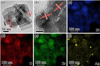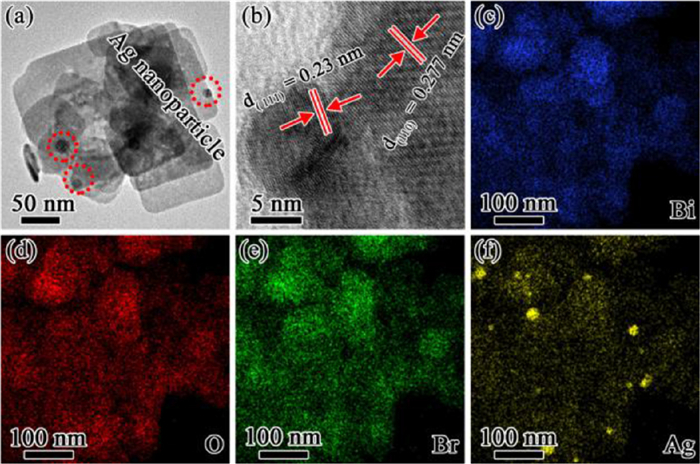 | Fig. 1. (a) TEM and (b) HR-TEM images of Ag/BiOBr-2. Elemental mapping images about (c) Bi, (d) O, (e) Br and (f) Ag of Ag/BiOBr-2. | |