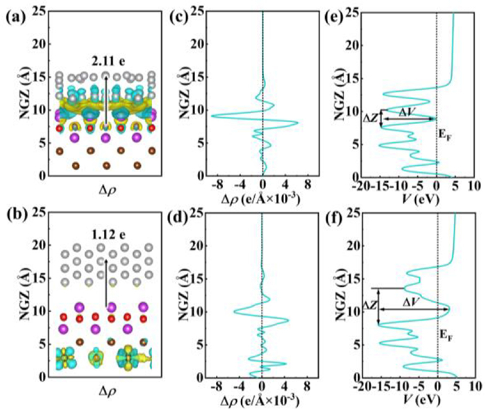 The Bader charge results show that per supercell can transfer about 2.11 electrons to Ag layer in-situ constructed Ag/BiOBr, while the physically mixed Ag and BiOBr (denoted as Ag/BiOBr-M) only transfer 1.12 electrons, suggesting that in-situ constructed strong interfacial contact structure can achieve ultrafast charge transfer [45]. Moreover, the built-in electric field can be constructed between Ag and BiOBr, boosting the charge transfer. Figs. 2c and d show a significant charge redistribution after the construction of Ag/BiOBr interfacial, while there is less charge transfer from BiOBr to Ag layer for Ag/BiOBr-M. The plane-averaged electrostatic potential has been explored to estimate the charge transfer across the interface, which along the Z direction across the interface. The in-situ formed Ag/BiOBr with closed interface to be the electron transport channels, and the tunneling potential barriers can be calculated to ΔV ≈ 14.45 eV and ΔZ ≈ 2.63 Å (Fig. 2e), while the potential barrier for physically mixed Ag/BiOBr-M can be evaluated via ΔV ≈ 18.93 eV and ΔZ ≈ 5.58 Å (Fig. 2f). There are hardly any energy barriers at the Fermi level for Ag/BiOBr heterostructure, while the electrons at Fermi level possess a tunnel barrier of ΔV ≈ 2.24 eV and ΔZ ≈ 3.05 Å, which will hinder charge transfer over the interface. All above results show that the close contact interfacial structure between Ag nanoparticles and BiOBr can achieve excellent electrons transfer.