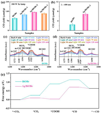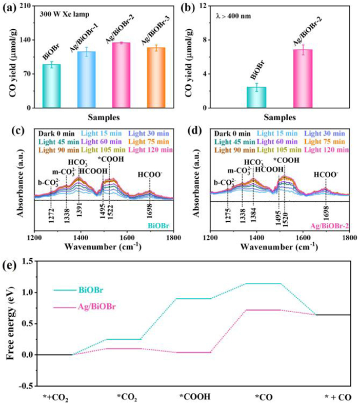 | Fig. 3. CO yield of BiOBr and Ag/BiOBr after 5 h reaction. (a) 300 W Xe lamp and (b) visible light irradiation. In-situ FT-IR spectra of (c) BiOBr and (d) Ag/BiOBr-2. (e) Calculated free energy diagrams of the photocatalytic CO2 reduction to CO over BiOBr and Ag/BiOBr. | |