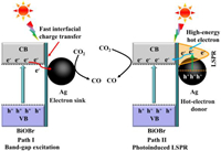 Based on all above experimental and calculated results, the possible CO2 photoreduction mechanism can be proposed. As shown in Fig. 4, under semiconductor excitation, the electrons in BiOBr can be excited to the CB, the excited electrons were captured by Ag nanoparticles on the surface of BiOBr. Afterwards, the adsorbed CO2 molecule can be activated and convert to possible intermediates. Finally, the intermediates further generate the CO. While under light irradiation on the plasma resonance range, the LSPR absorption of Ag nanoparticles boost the generation of high-energy plasmonic hot electrons. Next, the hot electrons inject to the conduction band and trigger the CO2 molecule photoreduction into CO. Hence, the CO2 molecule can achieve an excellent photoreduction on Ag nanoparticles coupled BiOBr.