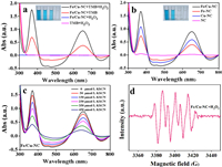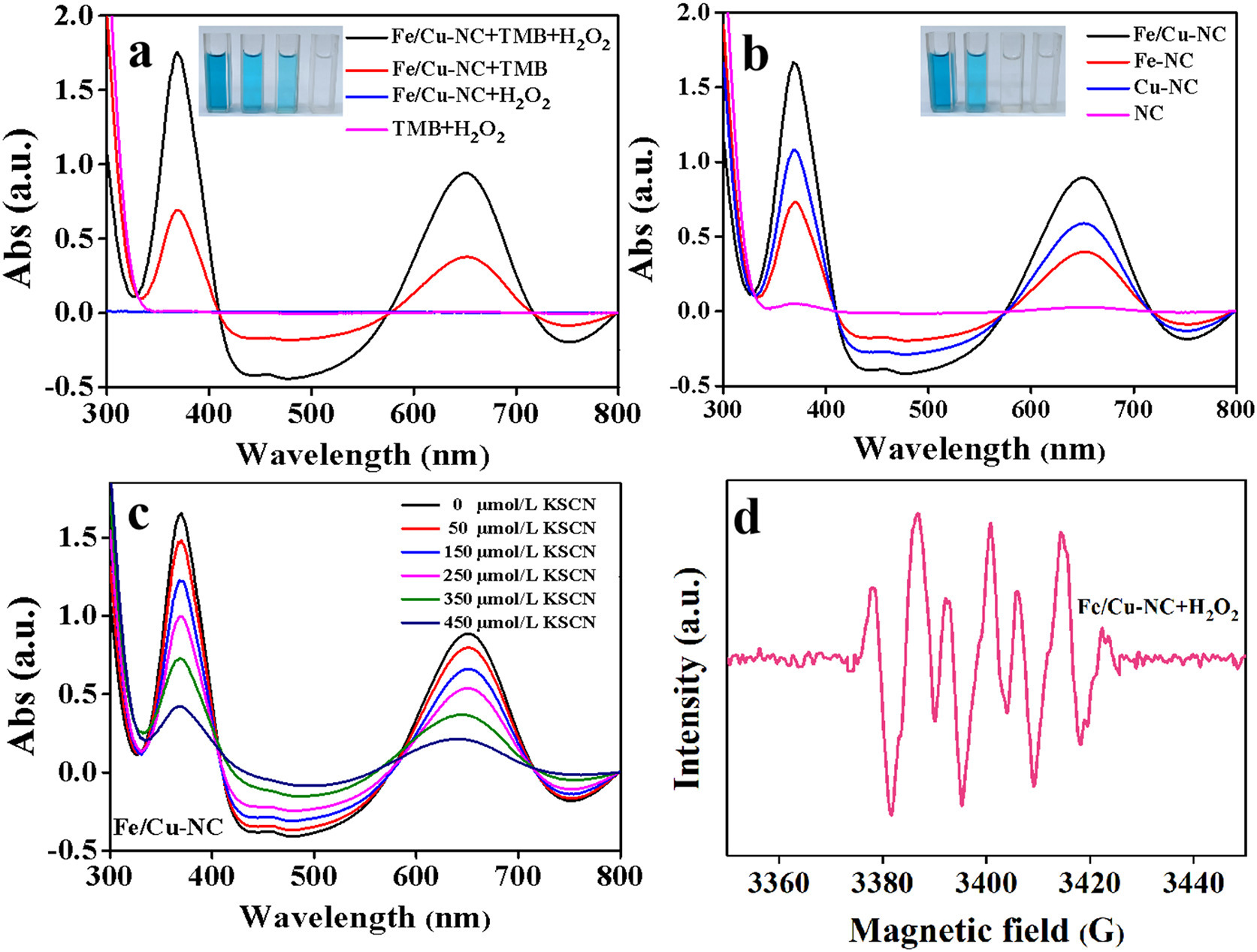| Fig. 3. (a) Study on peroxidase-like activity of Fe/Cu-NC single-atom catalysts. (b) Comparison of the UV–vis spectra of the enzyme-like activities of Fe-NC, Cu-NC, and Fe/Cu-NC (the inserted picture is a photo of the reaction under sunlight). (c) UV–vis spectra changes of Fe/Cu-NC/TMB/H2O2 solution upon the addition of various concentrations of SCN−. (d) ESR spectra of the DMPO/•O2− spin adduct of Fe/Cu-NC/H2O2. | |
