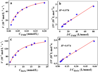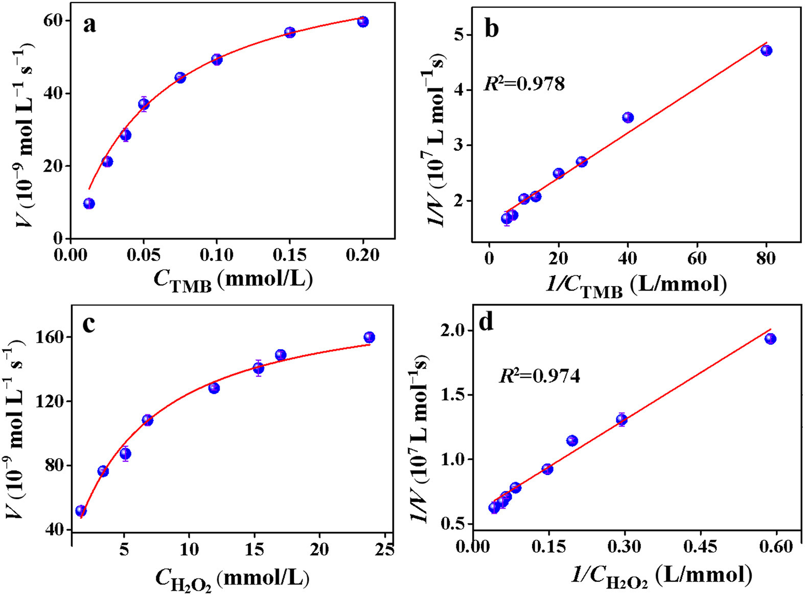 | Fig. 4. Steady-state kinetic assay of the Fe/Cu-NC SAzymes for (a, b) TMB and (c, d) H2O2. | |
