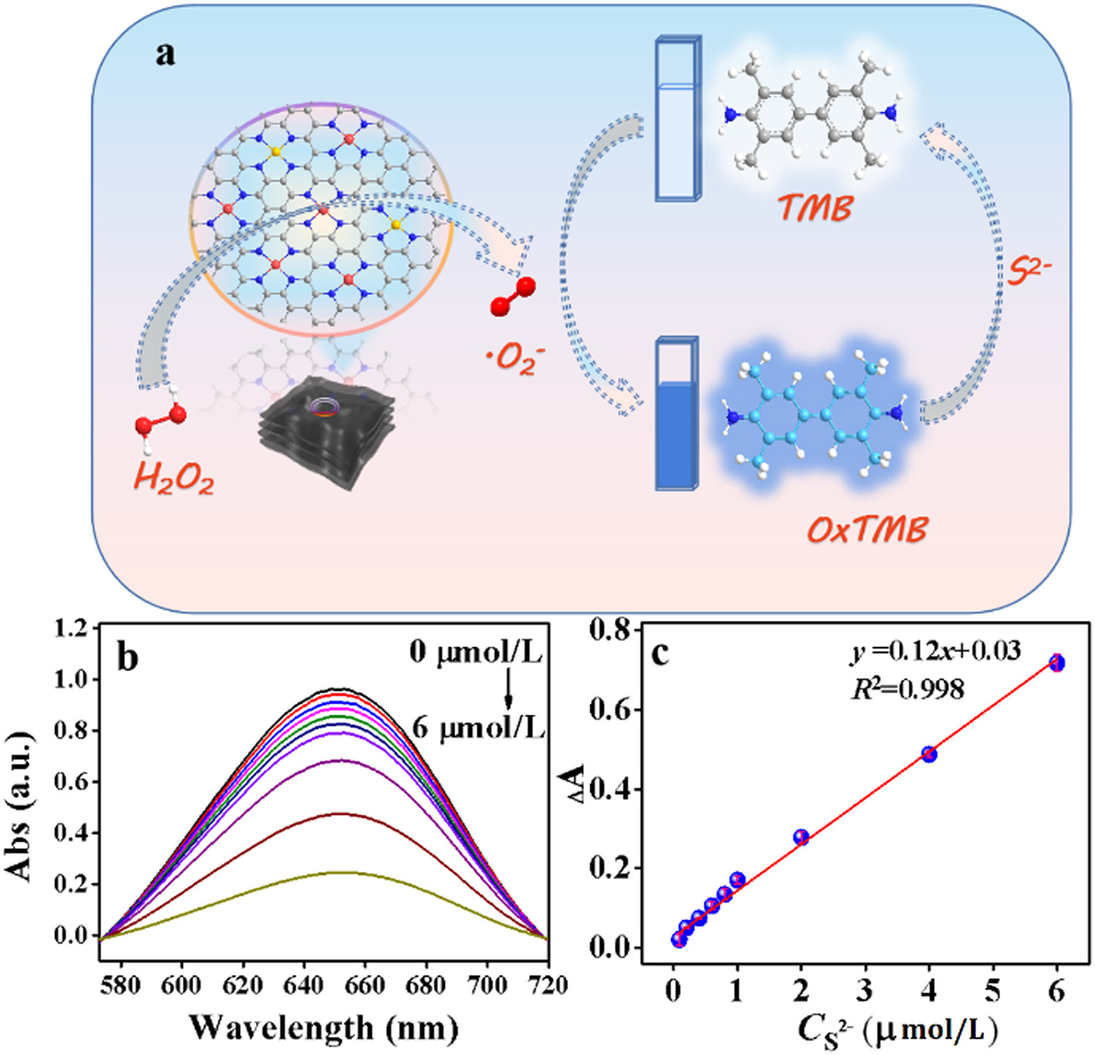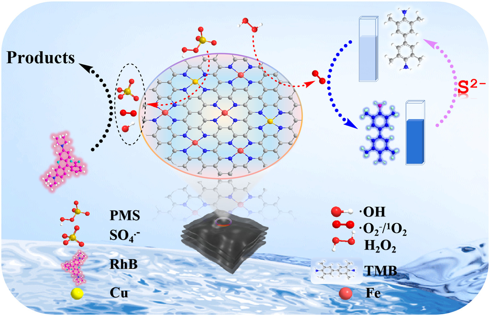 Herein, a single-atom nanozyme (Fe/Cu-NC SAzyme) with bimetallic active sites was designed and synthesized by a one-pot hydrothermal method and pyrolysis method, which can be used for colorimetric detection of S2− and degradation of dyes. When S2− was added to the Fe/Cu-NC/TMB/H2O2 system, blue oxTMB was reduced to colorless TMB, thus constructing a colorimetric sensing platform for the detection of sulfide ions. A linear activity range of 0.09–6 µmol/L was obtained with a low detection limit of 30 nmol/L, which is superior to the most published optical S2− assays. Fe/Cu-NC can also activate PMS to generate SO4•− and other free radicals and effectively degrade rhodamine B (RhB), malachite green oxalate (MG), and methylene blue (MB) within 10 min (Scheme 1). Therefore, the bifunctional role of Fe/Cu-NC SACs in detection and dye degradation was developed.
