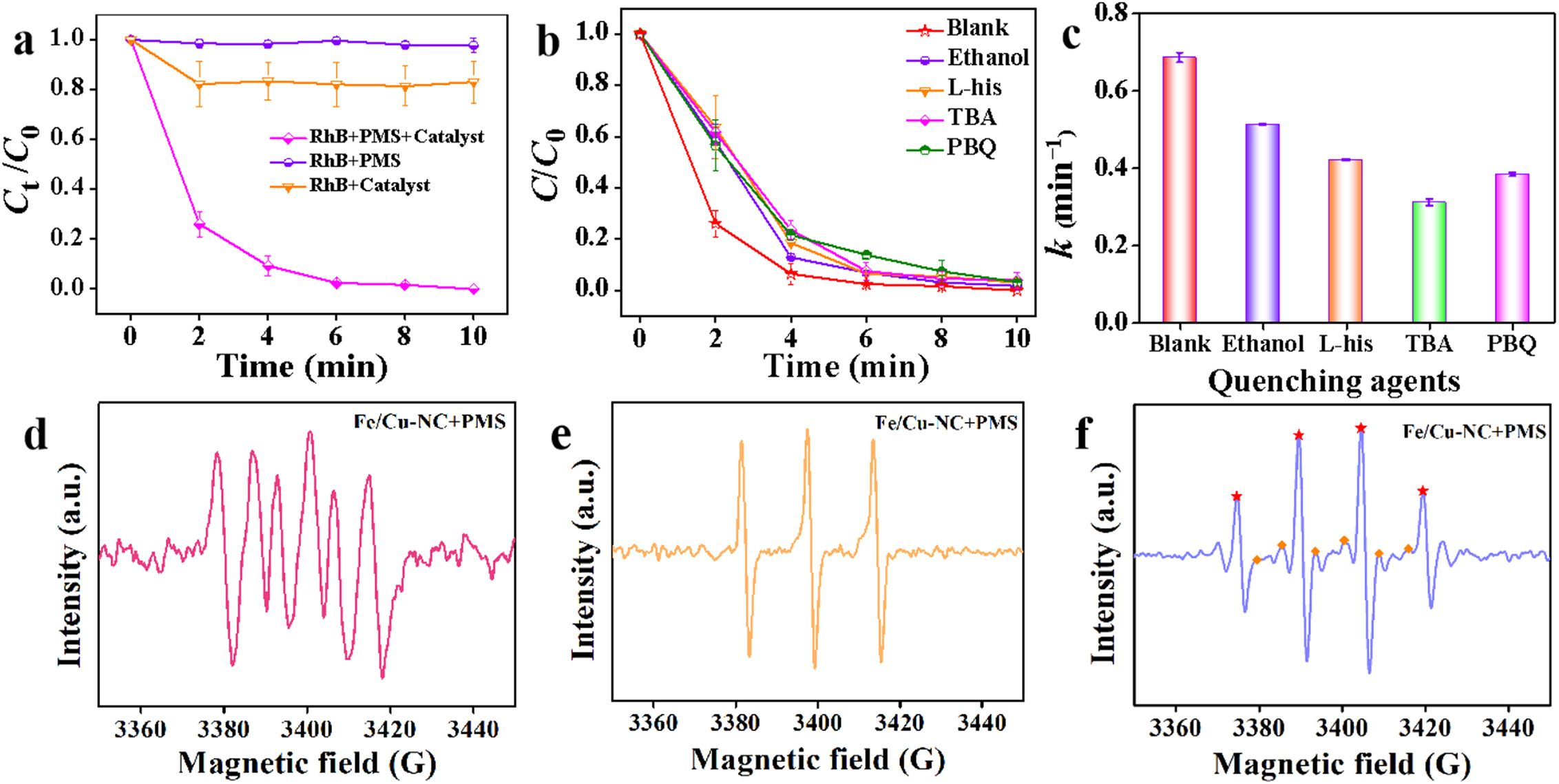 | Fig. 6. (a) RhB degradation in different reaction systems, (b) degradation rates of different quenchers in the Fe/Cu-NC/PMS system, and (c) effects of different quenching agents on reaction rate constants in the Fe/Cu-NC/PMS system. (d) DMPO-trapped EPR spectra of •O2−. (e) TEMP-trapped EPR spectra of 1O2. (f) DMPO-trapped EPR spectra of SO4•− and •OH (✭ represents DMPO-•OH, and ◆ represents DMPO-SO4•−. | |