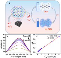 | Fig. 5. (a) Schematic diagram of the colorimetric S2− activity assay, (b) effects of different S2− concentrations on the UV–vis spectra of Fe/Cu-NC SAzymes, (c) the linear relationship between the Abs and S2− concentration. LOD = 30 nmol/L. | |