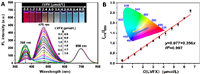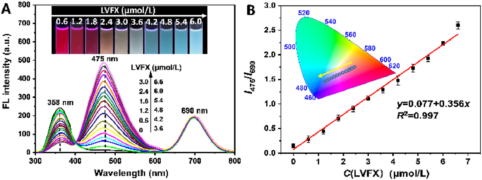 | Fig. 1. (A) The spectra of the sensors with the addition of LVFX. The fluorescence intensities of LVFX and CdTe QDs were tuned to a ratio of 2.5:1. (B) Plot of the I475/I690 ratio versus the concentrations of LVFX. The chromaticity diagram is shown in the inset of Fig. 1B. | |
