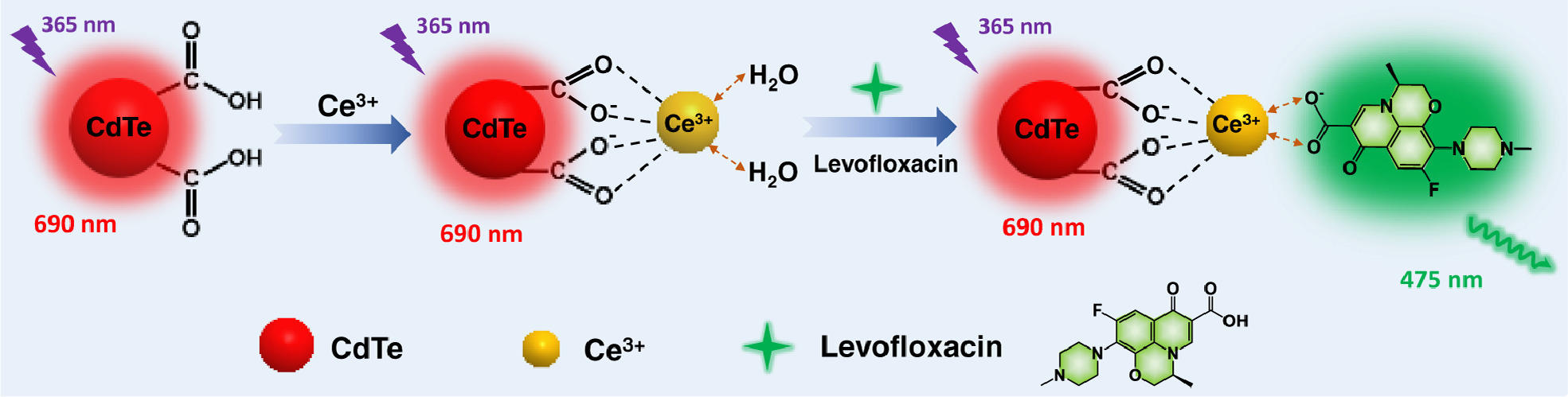Due to the presence of a large number of negatively charged carboxyl groups on the surface of CdTe quantum dots, Ce3+ can undergo a specific strong chelation reaction and be immobilized on the surface of CdTe quantum dots, as shown in Scheme 1. After adding LVFX, LVFX can replace water molecules to coordinate with Ce3+ due to the high coordination strength between LVFX and Ce3+. Due to strong bonding with LVFX, the surface electron distribution of Ce will be shifted and then affect the Ce atom, thus the Ce atom to exhibit a bivalent state. This is attributed to the fact that the core ion Ce3+ is in the d0 electron valence state, which means there are no electrons in the orbit and therefore no CFAE loss. With the continuous addition of LVFX, this fluorescent probe provides a noticeable color variation from red to green. Here, the complex Ce/CdTe QDs exhibit the visual fluorescence linear relationship to LVFX, Ce3+ functions as a specialized recognition unit for LVFX, culminating in green-emitting Ce-LVFX, while the red fluorescence of quantum dots as a reference signal remains unchanged.