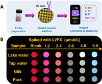 | Fig. 3. (A) Diagram of the detection process in real samples using the smartphone sensing platform. (B) Fluorescence photographs for detection of LVFX in lake water, tap water, milk and raw pork. | |