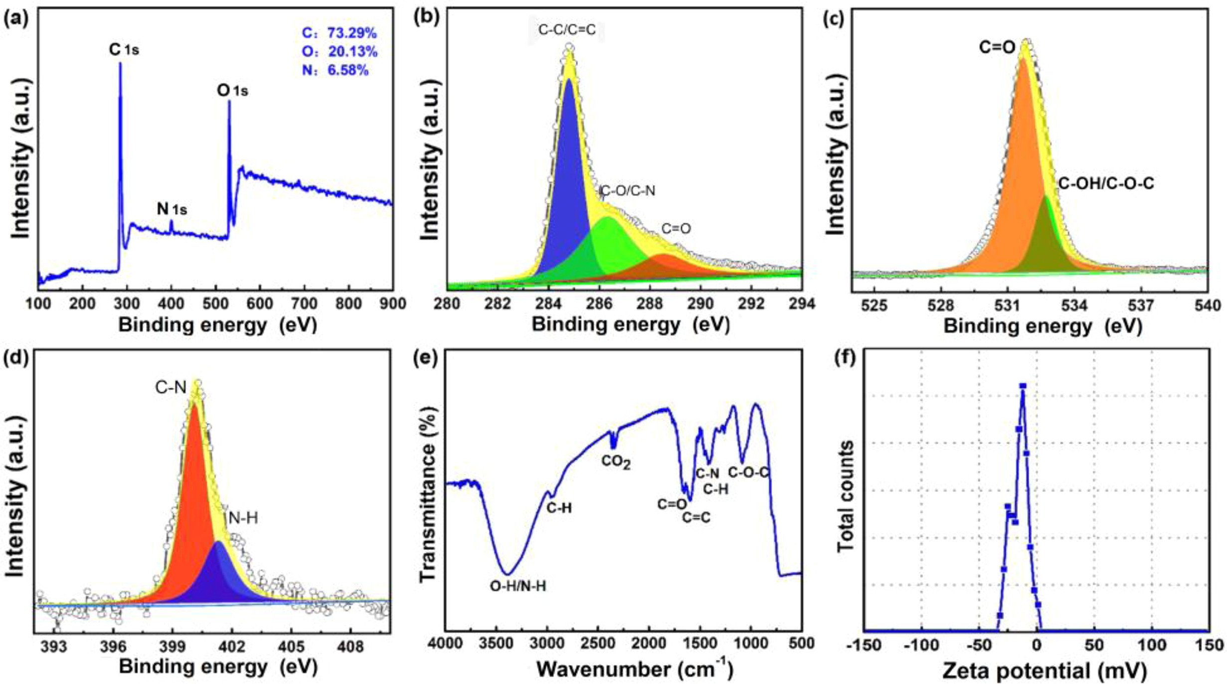 | Fig. 2. (a) XPS survey spectrum, (b) C 1s spectrum, (c) O 1s spectrum, (d) N 1s spectrum, (e) FTIR spectrum and (f) zeta potential curve of CQDs. | |
