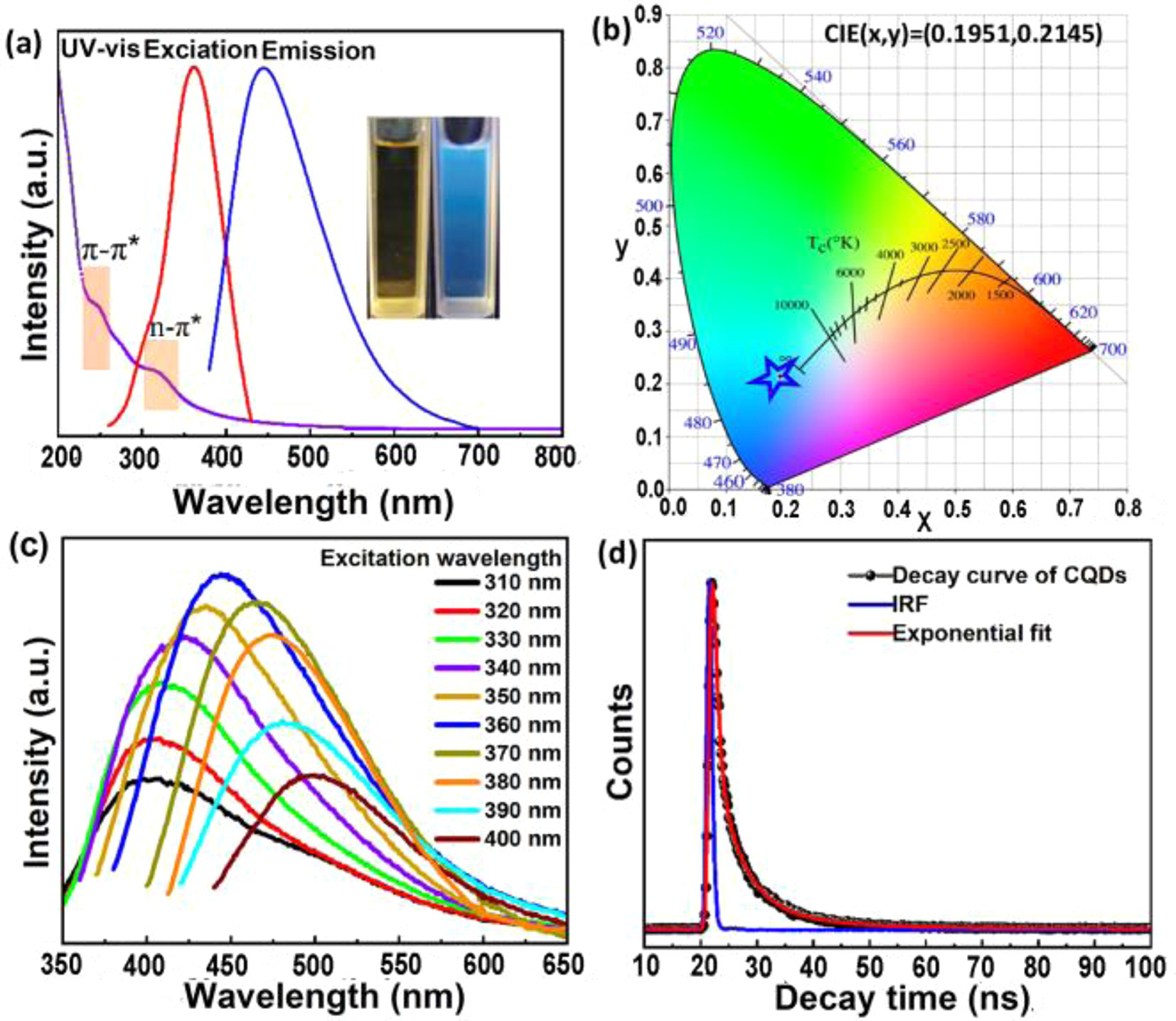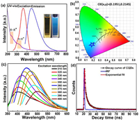| Fig. 3. (a) UV–vis absorption, PL excitation and emission spectra of CQDs in aqueous solutions (λex = 360 nm and λem = 440 nm); (inset) appearance of CQDs under daylight and 365 nm UV light illumination. (b) CIE coordinates of CQDs. (c) Excitation-emission PL spectra of CQDs. (d) Time-resolved decay and fitting curves of CQDs. | |