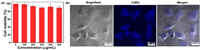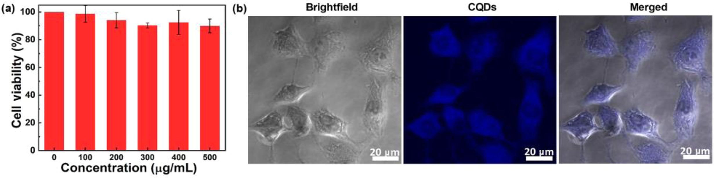 | Fig. 4. (a) Cell viability of A549 cells after 24 h incubation with various concentrations of CQDs. (b) Confocal fluorescence images of A549 cells after culture with 400 µg/mL CQDs. | |