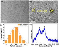 | Fig. 1. (a) TEM and (b) HRTEM micrograph images, (c) size distribution histogram and (d) Raman spectrum of CQDs. | |